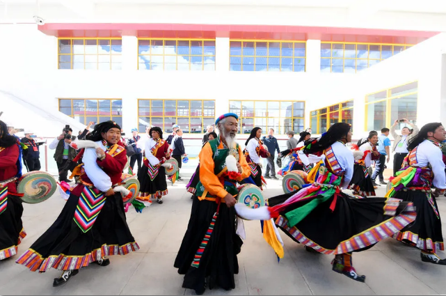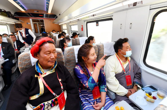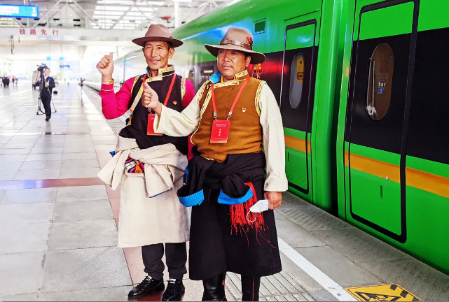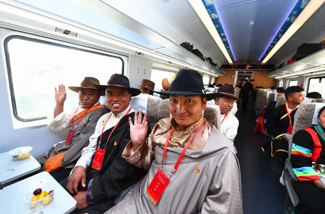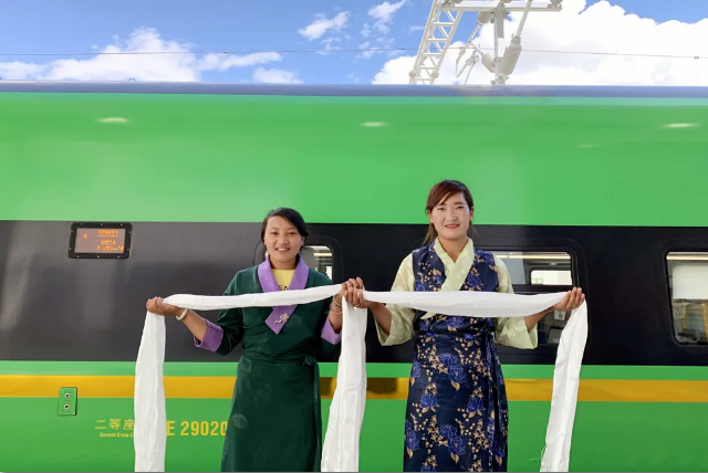 10时30分,D2021次复兴号动车组列车驶出拉萨站,一路疾驰奔向“西藏江南”林芝。沿途所经山南、米林等站,少数民族同胞身着盛装、载歌载舞迎接列车到来,欢庆西藏进入动车时代。