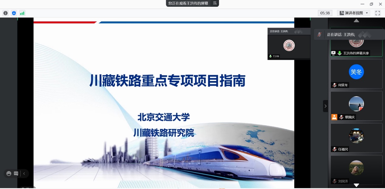 川藏铁路研究院王洪伟副院长做“川藏铁路重点专项”申报辅导报告,对川藏铁路建设中涉及的核心难点问题、重点专项主要进展、申报时间节点和注意事项等做了详细解读。