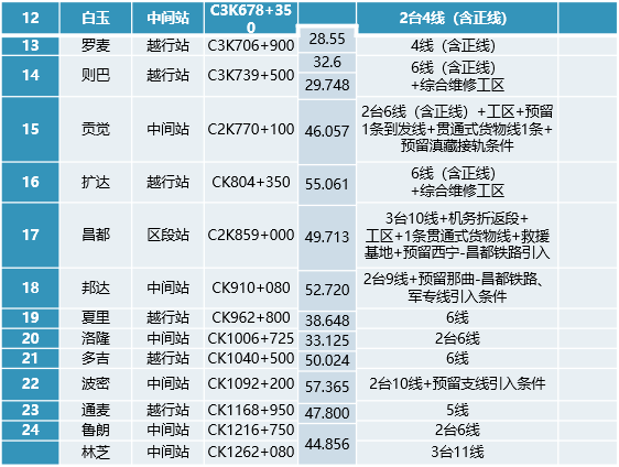 川藏线雅安至林芝段全线共设车站24座(不含雅安站和林芝站),其中区段站1座(昌都站),中间站15座,越行站8座。